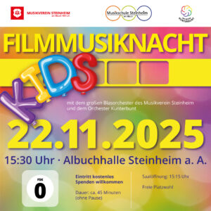 Freuen Sie sich auf ein unterhaltsames und einzigartiges Erlebnis mit Ihren Kindern! Das große Blasorchester des Musikverein Steinheim und das Orchester Kunterbunt, unter der Leitung von Norbert Hann, Jan Jäger, Christoph Braun und Sebastian Jäger sorgen für ein musikalisches Abenteuer. Passend zur Musik werden die bekannten Szenen auf einer großen Leinwand gezeigt – wie bei einer richtigen „Filmmusiknacht“ eben!