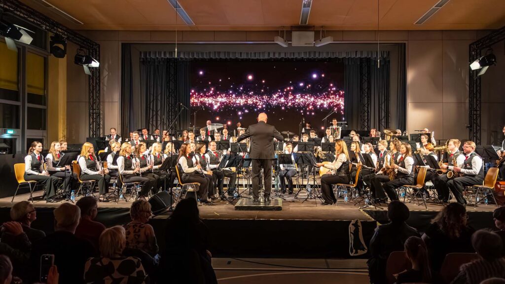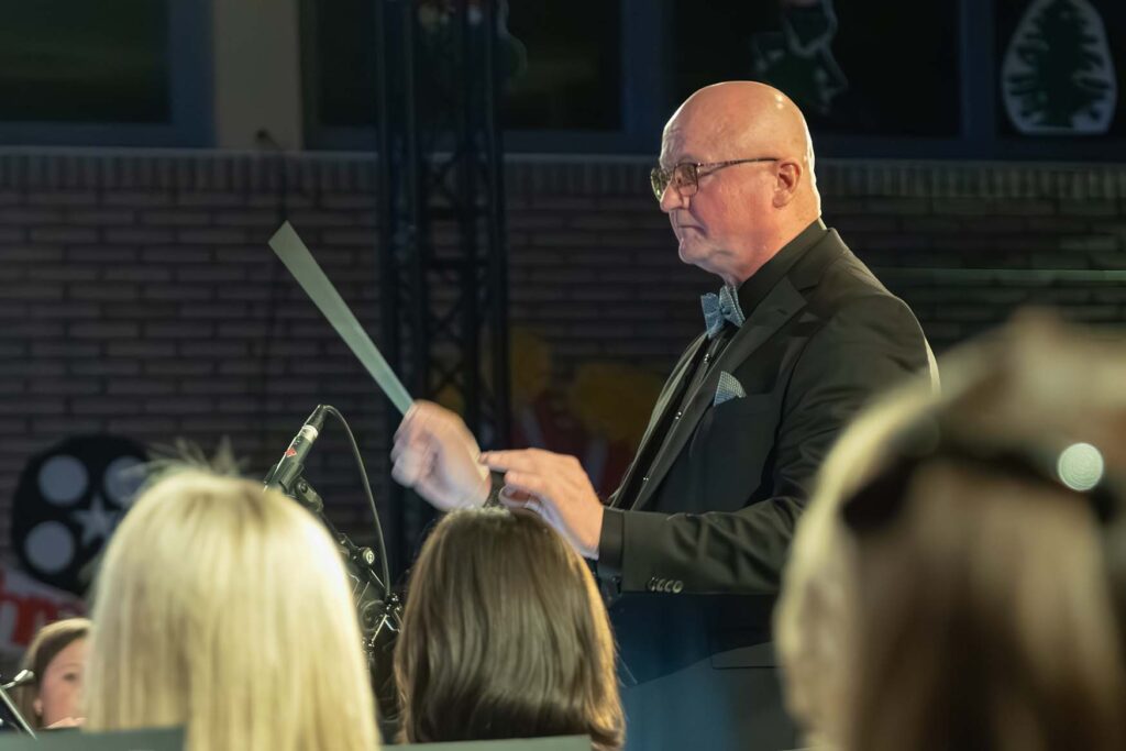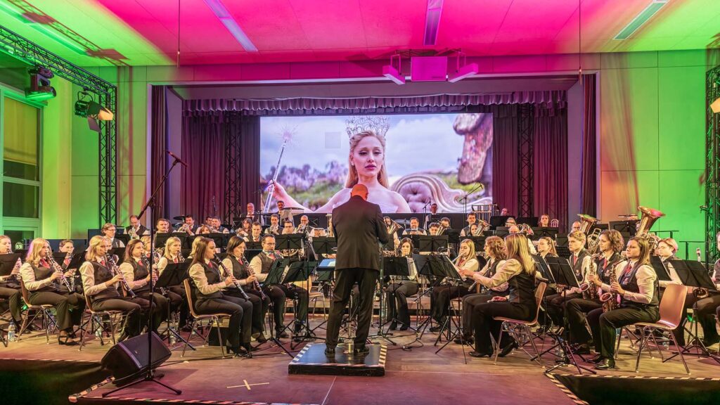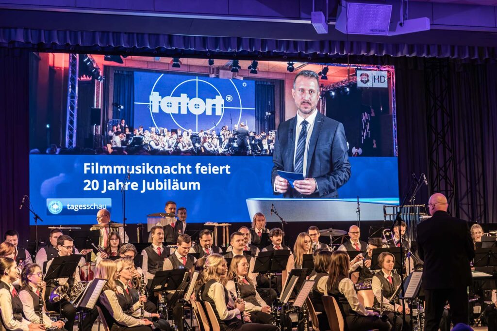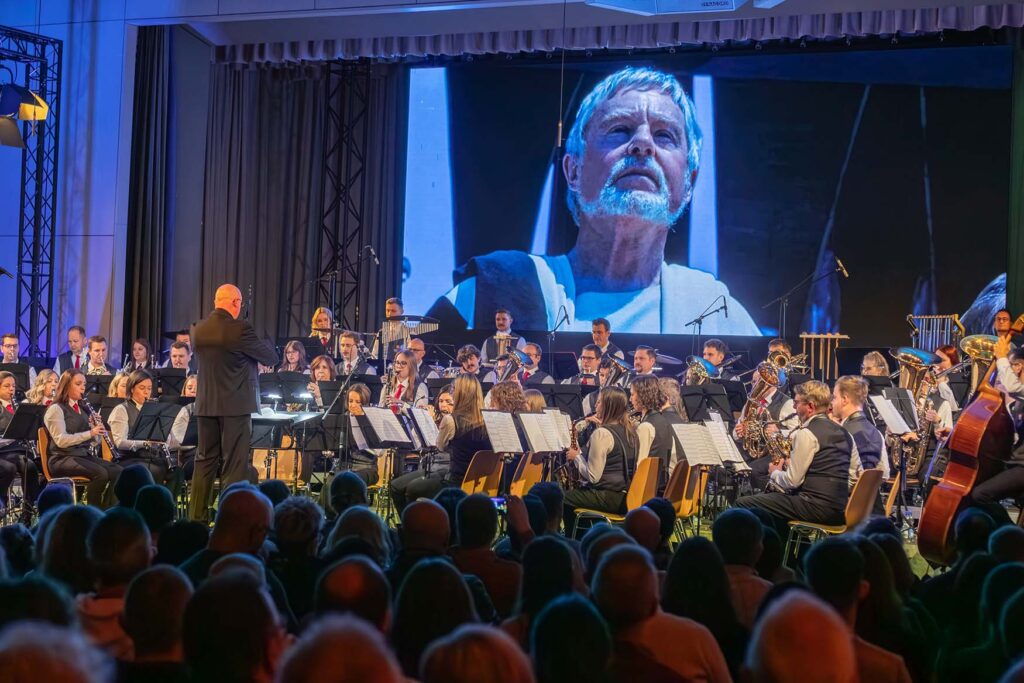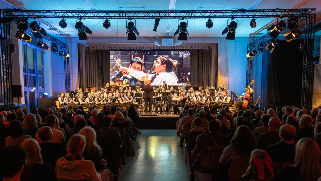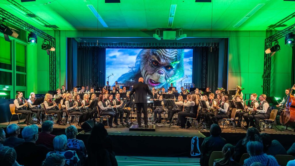 Auch 2025 setzte das Team der neuen Vorsitzenden auf die bewährte Mischung aus eindrucksvollen Filmszenen und perfekt darauf abgestimmter Blasmusik. Dennis Hanert war erneut dafür verantwortlich, die Filmausschnitte maßgeschneidert auf das ausgewählte Notenmaterial zuzuschneiden. Marita Kasischke führte mit Fachkenntnis und Charme durch das Programm und ließ es sich nicht nehmen, spannende Hintergrundgeschichten zu Filmen, Komponisten und Schauspielern einfließen zu lassen. Ein besonderes Highlight der Jubiläumsausgabe war die Rückkehr von Ehrendirigent und Mitbegründer Norbert Hann, welcher das große Blasorchester mit spürbarer Leidenschaft durch das Programm leitete, das die ganze Bandbreite der Filmmusik zeigte.