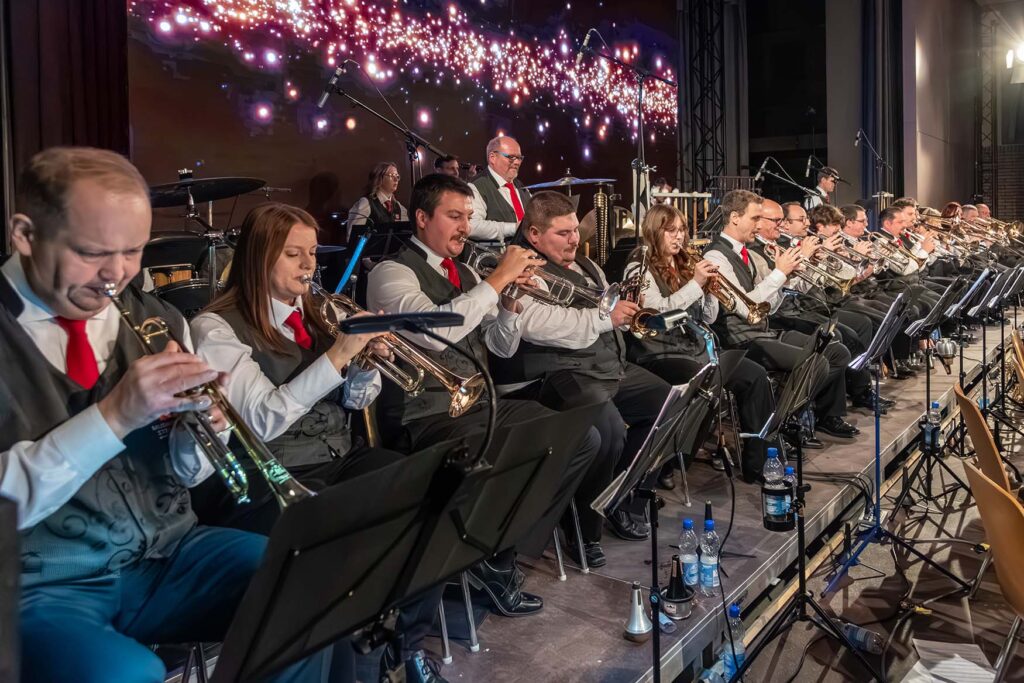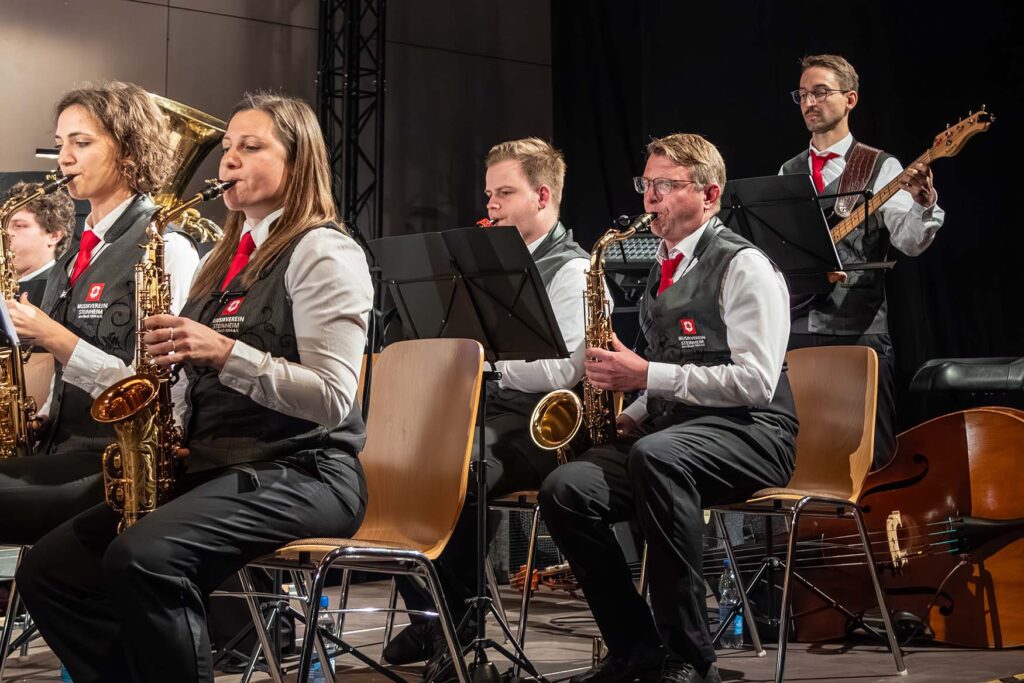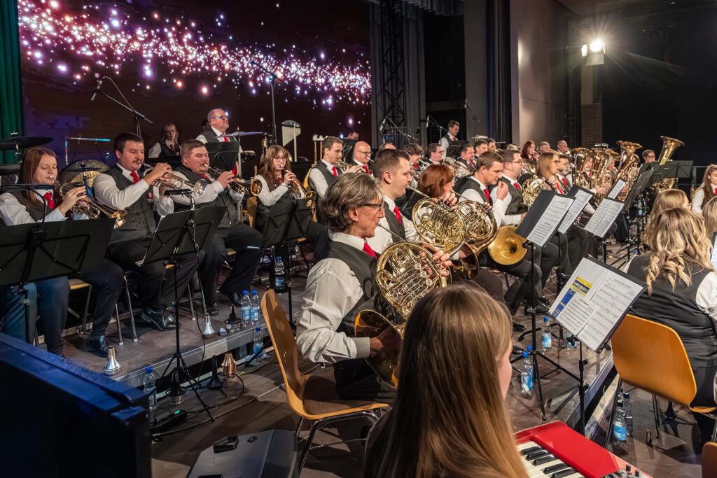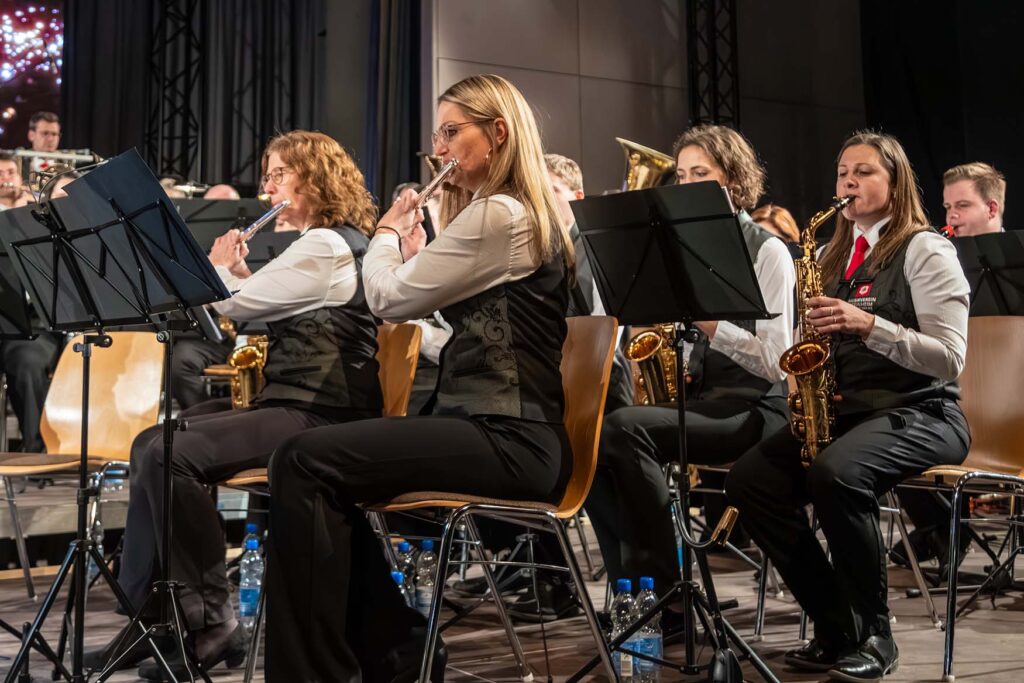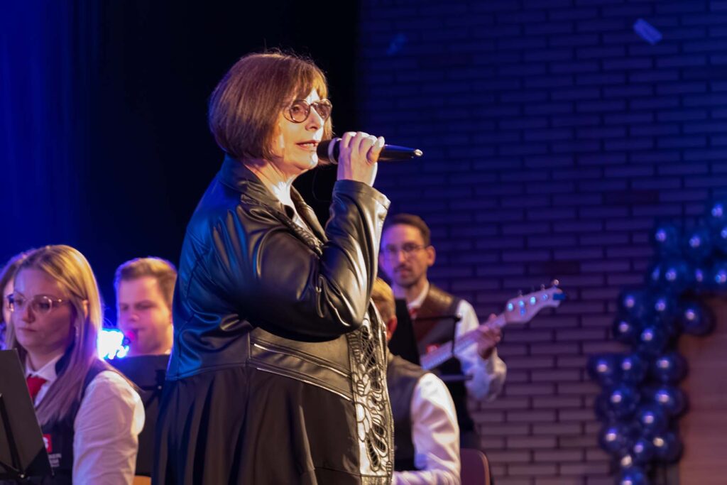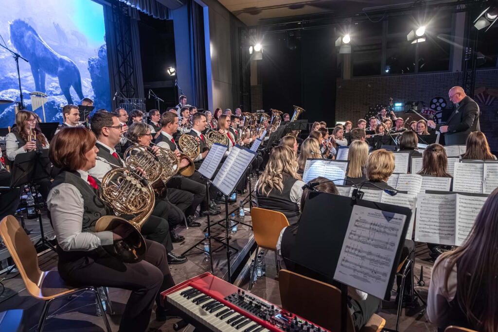 Wie in den vergangenen Jahren eröffnete das Große Blasorchester die Filmmusiknacht traditionell mit der Tagesschau und dem anschließenden Tatort, bevor die eindrucksvollen Klänge aus Afrika mit dem Stück „Der König der Löwen“ die Bühne erfüllten. Besonders beeindruckend gelang die Interpretation von „Schindlers Liste“, bei der Marion Zenker als Solistin an der Violine mit großer Ausdruckskraft glänzte. Mit Musik aus „Gladiator“ setzte das Orchester kraftvolle Akzente, ehe Regina Heiß erstmals an diesem Abend gesanglich zum Film „Top Gun“ in Erscheinung trat.
