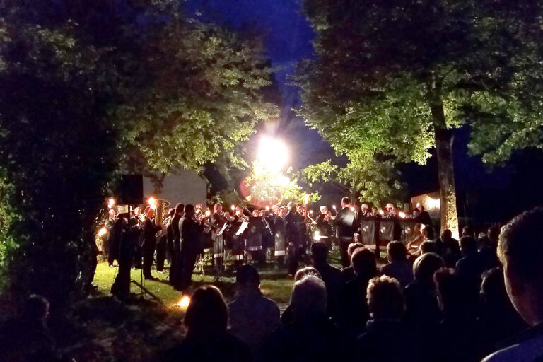 Zur Serenade im Fackelschein fanden sich wieder viele Besucher auf dem romantischen Klosterhof ein. Aufgrund der etwas unsicheren Wetterlage waren es leider nicht so viel Zuhörer wie in den vergangenen Jahren. Nachdem sich das anfängliche Tröpfeln eingestellt hatte, wurden die Anwesenden an einem dann doch lauen Abend mit schöner Blasmusik belohnt. Es erklang der „Florentiner…
