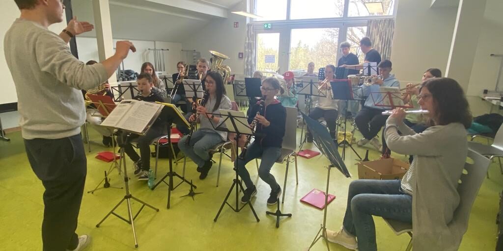 Am Freitag ging es für unser Kooperationsorchester Kunterbunt auf Probewochenende. Zwei Nächte übernachteten wir in der Jugendherberge Hohenstaufen bei Göppingen, um dort intensiv zu proben, aber auch viel Spaß zu haben. Für manche unserer jüngeren Mitglieder war dies die erste Nacht auswärts ohne Eltern. Doch das ließen sich die Kinder nicht anmerken und überraschten die Betreuer mit nicht enden wollender Energie, um schließlich am nächsten Morgen nach nur wenigen Stunden Schlaf wieder topfit in der Probe zu sitzen und sogar vor Auftauchen des Dirigenten mit dem Üben zu beginnen. Neben dem Musizieren wurden in vielen lustigen Spielen Hinweise erbeutet, die am Samstagnachmittag den Weg zur Burgruine Hohenstaufen aufzeigten, wo ein versteckter Schatz wartete.