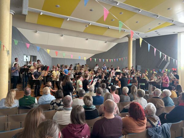 Das Publikum durfte im nahezu vollbesetzten Dieter-Eisele-Saal beim Gemeinschaftskonzert drei spielfreudige Orchester und viele begeisterte Jungmusikerinnen und Jungmusiker erleben. Begonnen hat die Jugendkapelle des Musikverein Söhnstetten, gefolgt von der Bläserklasse der Hillerschule und dem Kooperationsorchester Kunterbunt von Musikschule und Musikverein Steinheim. Im großen Finale spielten alle Orchester gemeinsam zwei schmissige Zugaben. Das Motto „Musik verbindet“…